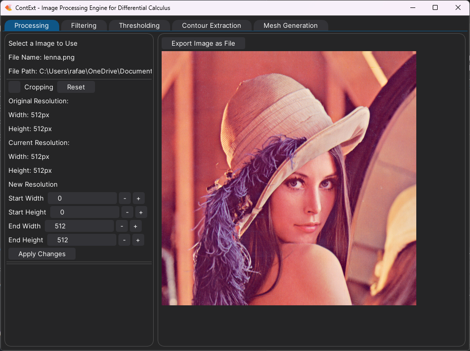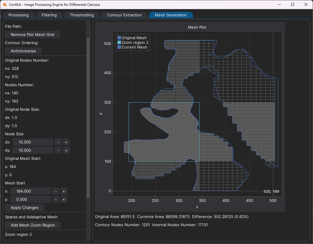 ContExt is a desktop application for image processing, contour extraction, interpolation, and sparse or adaptive mesh generation for numerical analysis workflows.