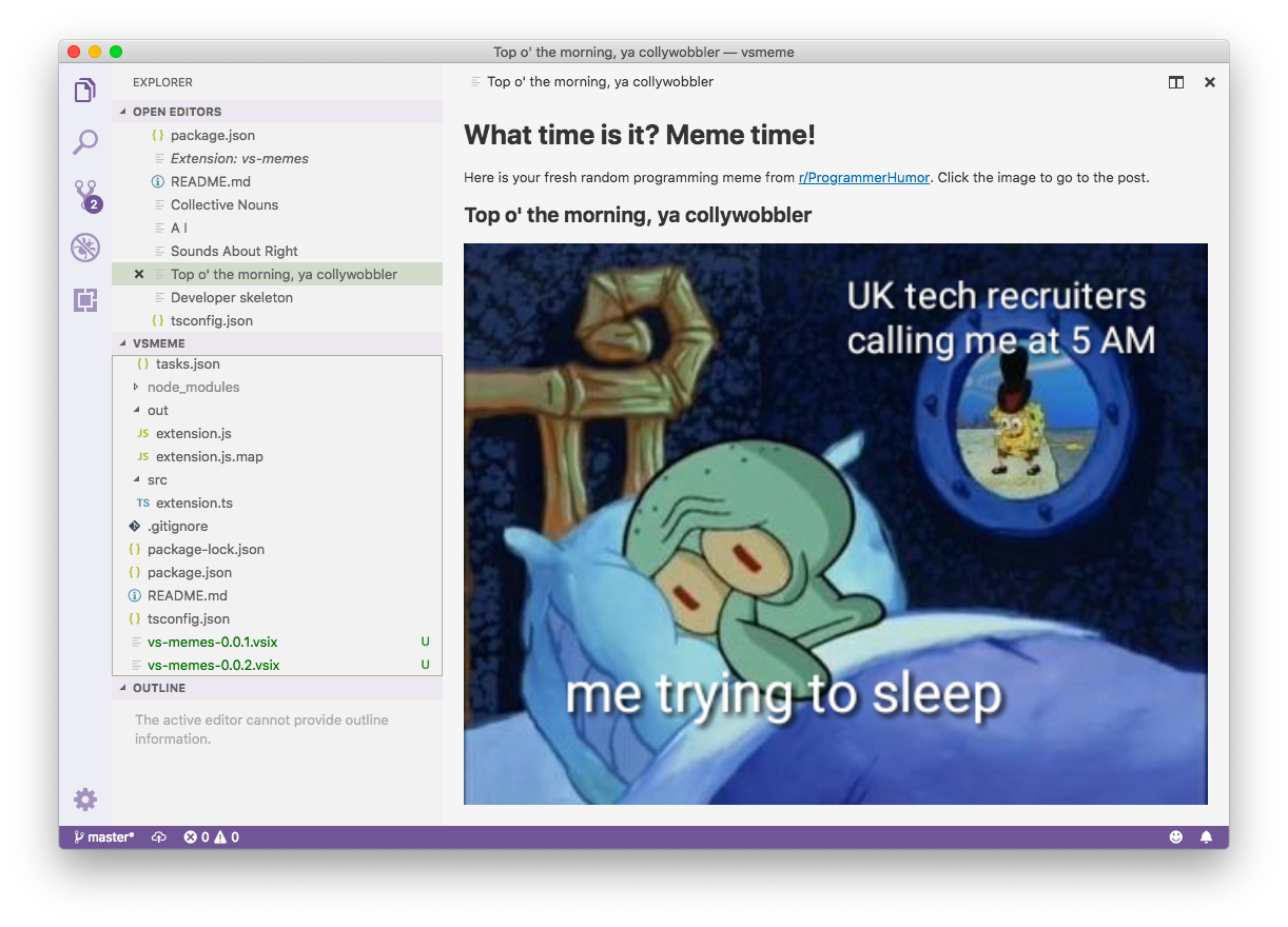 Visual® Studio™ Code™️ Memes® brings amusing memes to the code editor, the place where innovation is born. That place is now merged with good entertainment for our keyboard heroes, programmers will now be shown random programming memes each five minutes, to relax and forget about their bugs and errors while they read a good meme.