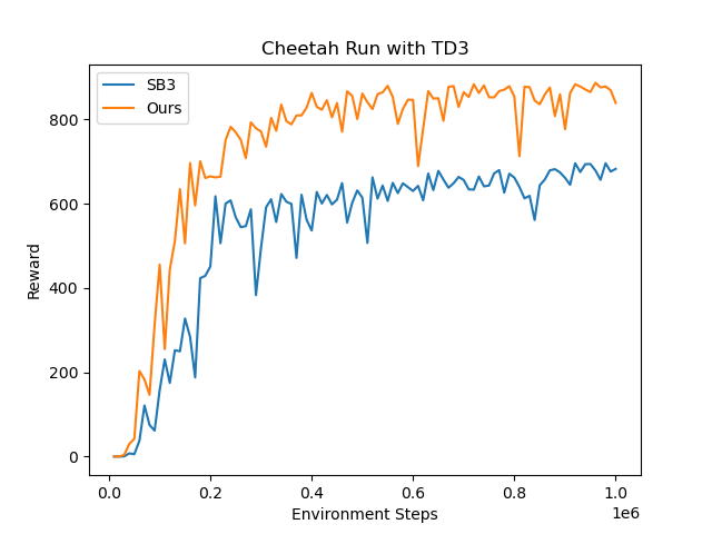 All benchmarks of RL algorithms were run using GTX 1080 Ti GPUs, eight CPU cores, and 16GB of memory. Hyperparameters for SAC were taken from pytorch_sac and hyperparameters for TD3 were left as the default as listed in the paper except with 256 dimensional Dense layers in the actor and critic. Evaluations were run on the DM Control Cheetah Run benchmark.