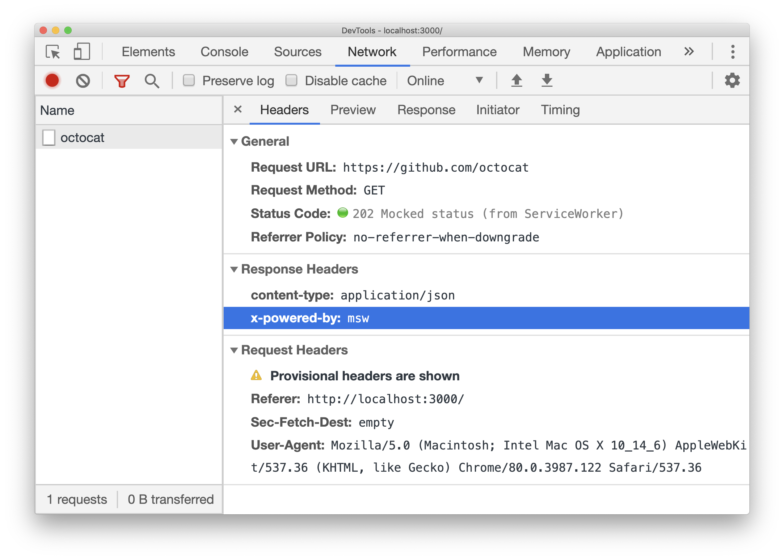 await worker.start()Performing a GET https://github.com/octocat request in your application will result into a mocked response that you can inspect in your browser's "Network" tab: